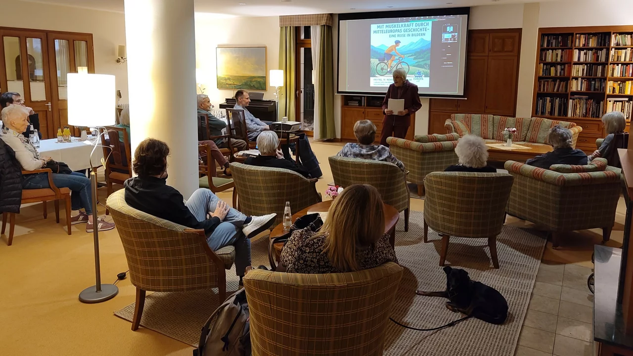 Eröffnet wurde die Veranstaltung durch die Vorsitzende Sibylle Dreher, die daran erinnerte, dass „Europa nicht zuerst ein politisches, sondern ein kulturelles und menschliches Projekt ist – getragen von Begegnung und Erinnerung“. In diesem Sinne nahm anschließend Markus Nowak, Geschäftsführer des Vereins, das Publikum mit auf eine außergewöhnliche Reise: eine 1.182 Kilometer lange Radtour quer durch Mitteleuropa.