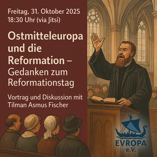 Den Auftakt der Veranstaltungsreihe von Evropa e. V. bildete ein digitaler Vortrag anlässlich des Reformationstags, der sich den vielschichtigen Verbindungen zwischen Reformation, Kultur und Identität in Ostmitteleuropa widmete. Referent war Tilman Asmus Fischer, Theologe, Autor und Zweiter Vorsitzender des Vereins.